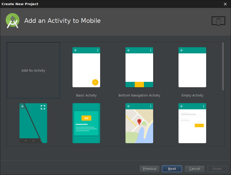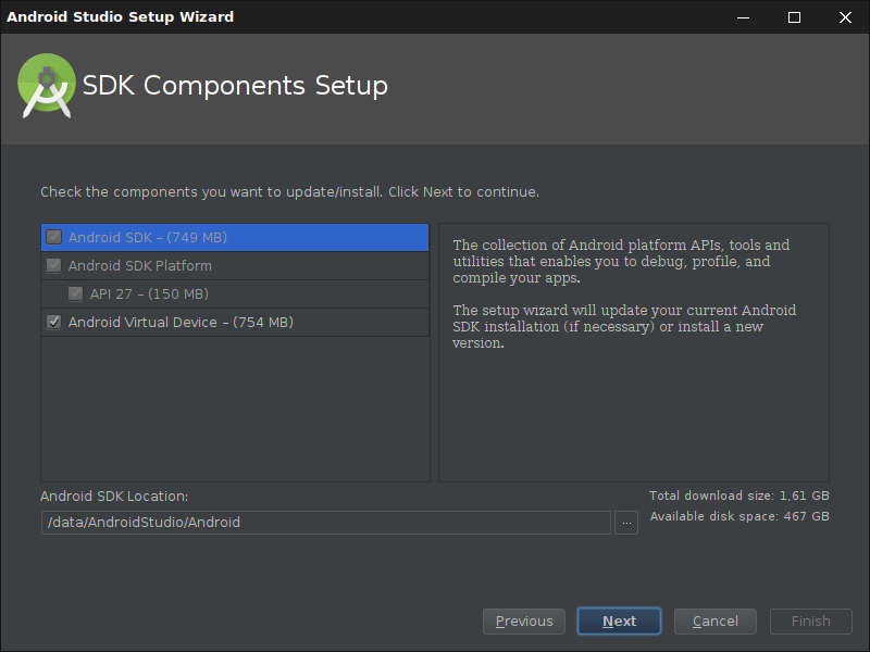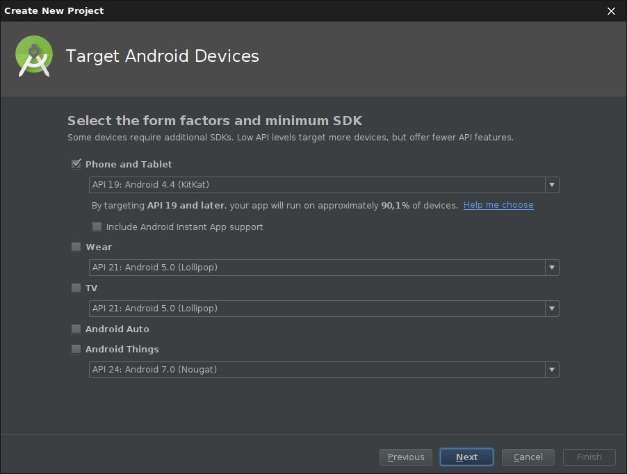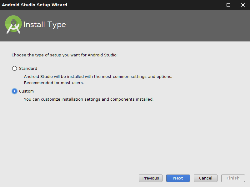 Der Benutzer kann entscheiden, ob Android Studio alle Einstellungen selbst vornehmen soll oder man die einzelnen Komponenten selbst auswählt: