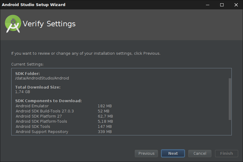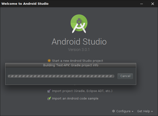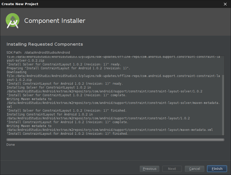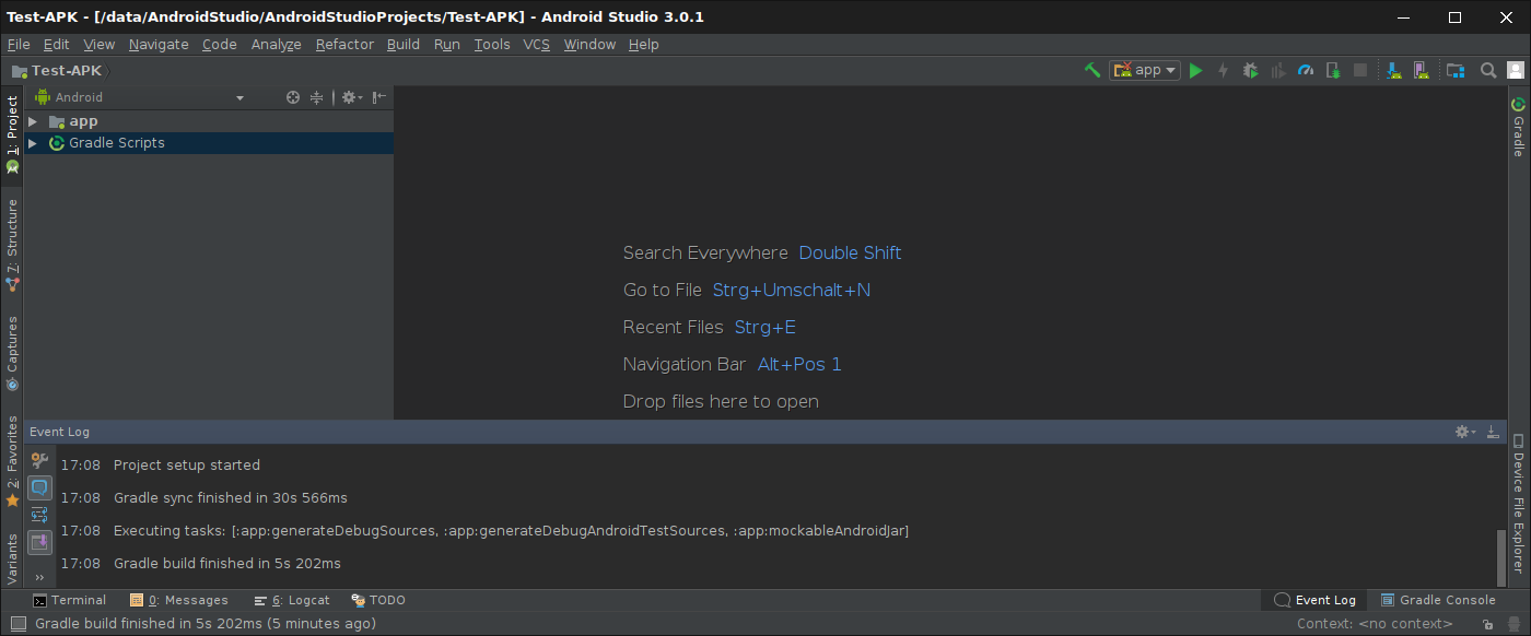 Das Programm „Android Studio“ kann in einer aktuellen Version von der Seite android.com heruntergeladen. Das ZIP-Archiv ist über 700 MB groß, der Download dauert also je nach Anbindung eine Weile. Das Archiv kann an beliebiger Stelle im Dateisystem entpackt werden, nachfolgend ist es das Verzeichnis „/data/AndroidStudio/AndroidStudio3.0“ (Das Verzeichnis „/data/“ ist eine eigene Partition).