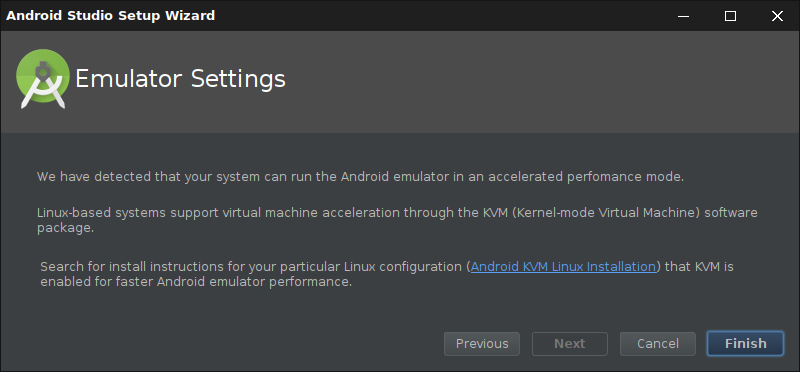 Es kann vorkommen, dass Android Studio einen Hinweis auf die Nutzung eines beschleunigten Emulatormodus hinweist: