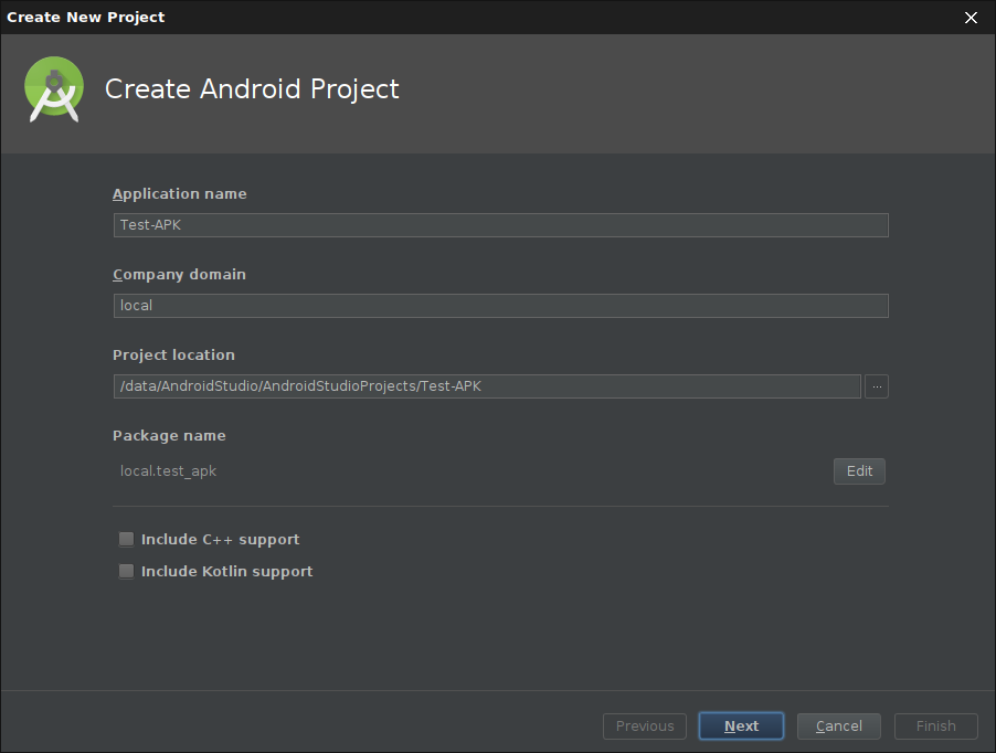 Für ein neues Projekt müssen einige Angaben gemacht werden: