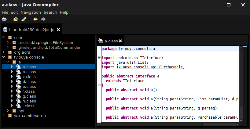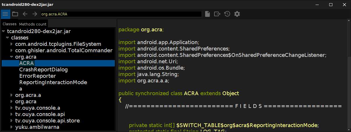 ~$ cp tcandroid280.apk apk/ ~$ d2j-dex2jar.sh apk/tcandroid280.apk dex2jar apk/tcandroid280.apk -> ./tcandroid280-dex2jar.jar